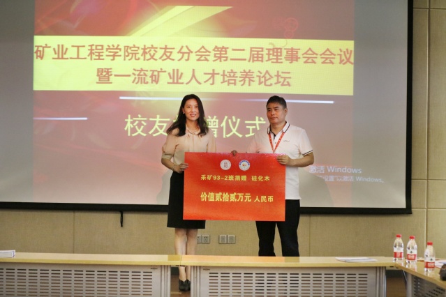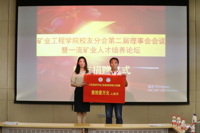 会上,举行了校友现场捐赠仪式,江苏高盛华宇电力设备有限公司董事长92级校友吕明俊、采矿93-2班校友代表上海大屯能源股份有限公司副总经理孙凯上台进行捐赠,行政副院长王晓琳代表果冻传媒