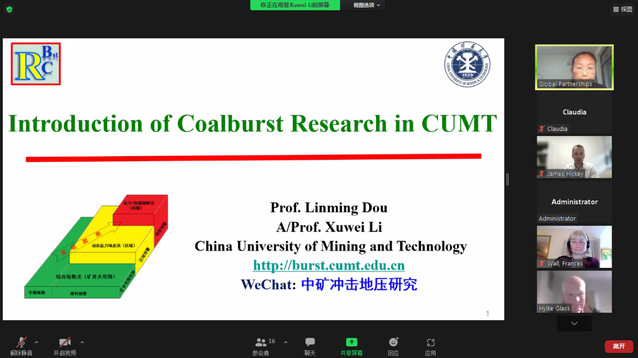 窦林名教授、黄鹏副教授、周伟教授和马立强教授先后作了题为Introduction of Coalburst Research in CUMT、Theory and Practice of Solid Backfill Coal Mining、Slope Designation and Analysis: Permanent and Static和Water Conservation Mining的主题报告。主题报告结束之后,双方参会人员结合个人研究方向和报告内容进行了深入交流与讨论,探寻潜在的科研合作机会,并同意会后就潜在合作机会进行进一步沟通,以期未来共同申请中英政府间合作项目和企业科研项目,夯实两校科研合作交流。