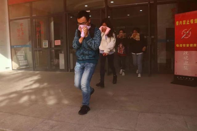 安全员按照制定的预案迅速组织师生疏散逃生。参演师生用湿毛巾捂住口、鼻,按照应急疏散指示标识和既定的应急疏散路线,安全有序地疏散到楼外安全区域。