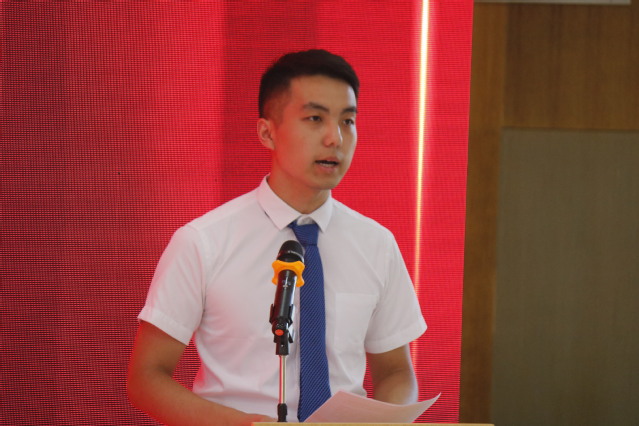 矿业类2019-8班刘政作为新生代表进行了发言,他表达了自己在矿大一百一十周年之际成为一名新时代矿业人的幸运与自豪,他号召同学们要有吃苦耐劳的品质,以“会当凌绝顶”的豪情壮志迎接新的生活、新的挑战,认真学习专业知识,积极投身社会实践,为矿大的未来发展贡献绵薄之力,为祖国的煤炭事业再添新彩。