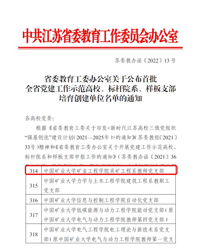 采矿工程系教师党支部入选首批江苏省党建工作样板支部培育创建单位。